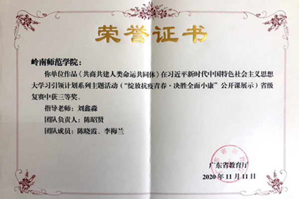 刘鑫淼指导的另一作品《共商共建人类命运共同体》获大学生讲思政课公开课作品省级复赛三等奖。该公开课结合时代发展的显著特点以及今年新冠疫情暴发的事件,展示构建人类命运共同体的中国方案和中国行动。