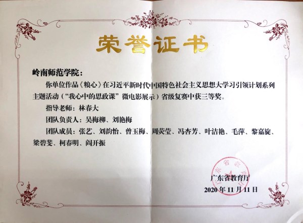 文学与传媒学院辅导员林春大指导的《粮心》获大学生“我心中的思政课”微电影展示作品省级复赛三等奖。该影片将粮食安全问题与思政课相结合,与形势与政策课程、课程思政推进的内在要求相关联,发挥文传学子读说写核心素养培育,倾力打造了集教学、育人、思政、第二课堂为一体的“思政实践育人新模式”。