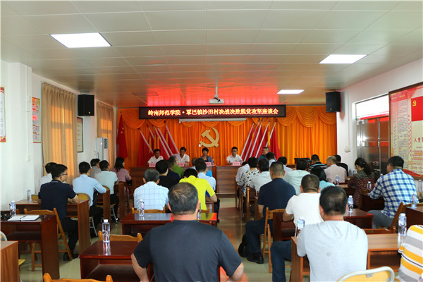 学校驻沙田村第一党支部书记叶德波从沙田村贫困户目前的情况、今年以来的主要工作、下阶段的主要工作等三个方面,详细汇报了驻村工作队的扶贫工作情况。截至目前,沙田村79户贫困户,215名贫困人口全部实现了“两不愁、三保障”,全部落实了“八有”,完成了精准扶贫任务的预期目标。