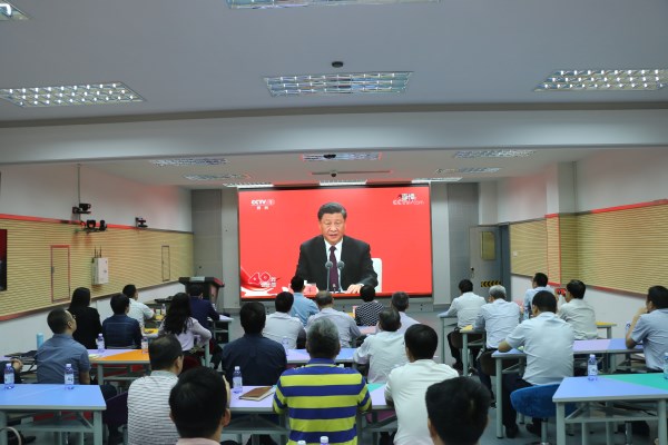 学校校领导在未来教育空间站集中观看庆祝大会(摄影赵宇清)