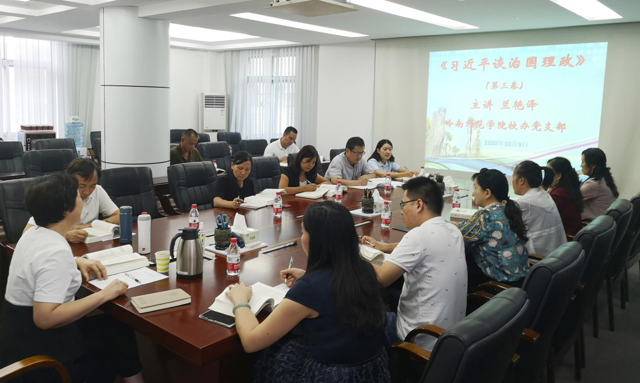 10月9日下午,校长办公室党支部在学校二号会议室召开支部大会。学校党委副书记、校长兰艳泽带领支部全体党员一起学习《习近平谈治国理政》第三卷并讲授党课。