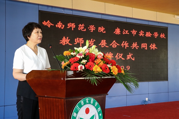 “共商双赢,同话发展!希望两校能借助共同体平台为广东省教育现代化建设贡献应尽之力,合力奏出独属岭南师范学院与廉江市实验学校的教师发展合作共同体特色强音!”兰艳泽代表学校感谢廉江市委市政府给予的大力支持和协助,指出“教师发展合作共同体”主动适应国家战略发展新需求,对标广东教育发展新形势,有利于助推两校教育教学改革实现不断深化、人才培养质量得到更好更快发展。这也是岭南师院长期以来聚焦立德树人根本任务,坚持内涵发展、特色办学,优化教育生态、创新育人机制、深化教育教学改革,提升人才培养质量的又一创新举措。