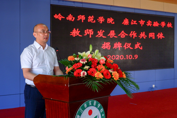 岭南师范学院校长兰艳泽、副校长戴黍,廉江市委副书记、市长庞晓冬,廉江市委常委、市人民政府党组成员木声隆,廉江市人民政府办公室主任李炳松,廉江市教育工委书记、市教育局局长叶春等领导共同为“教师发展合作共同体”揭牌。