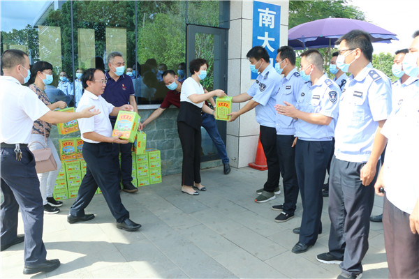 岭师新闻中心讯:7月20日上午,骄阳似火。学校校长兰艳泽、副校长、校工会主席苏古发一行冒着高温酷暑,参加校工会组织的 “夏日送清凉”走访慰问活动,为坚守在一线的基建施工人员和值守大门的安保人员,送上学校的关心关怀和防暑降温慰问品,叮嘱他们注意好身体,照顾好自己,并对他们的辛勤付出和无私奉献表示感谢!