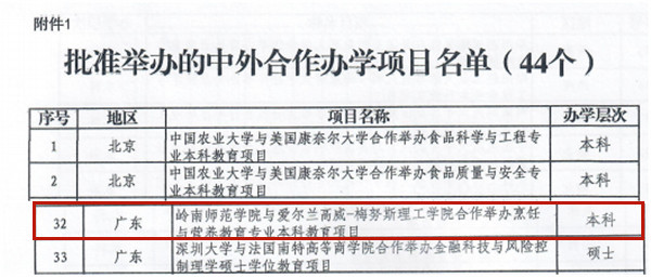 3月3日,教育部公布2019年下半年中外合作办学项目,岭南师范学院与爱尔兰高威—梅努斯理工学院合作的烹饪与营养教育专业本科教育项目“榜上有名”。该项目将纳入国家普通高等教育招生计划,计划于2020年开始招生,学制4年,采取“3+1”双校园教育模式,毕业生满足条件可同时获得两校“双学士”学位。