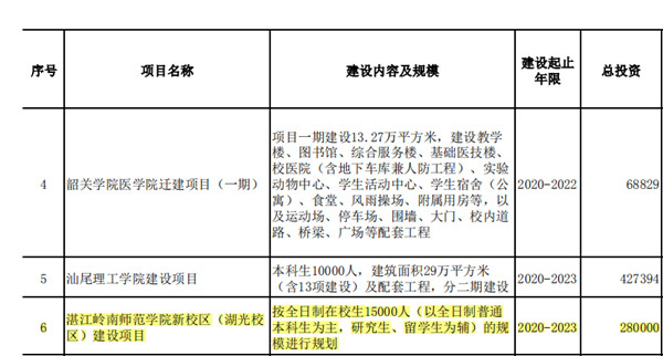 3月5日,广东发改委发布《广东省发展改革委关于下达广东省2020年重点建设项目计划的通知》,岭南师范学院新校区(湖光校区)建设项目“榜上有名”,被列入2020年重点建设项目计划和2020年新开工项目,计划投资28亿元。
