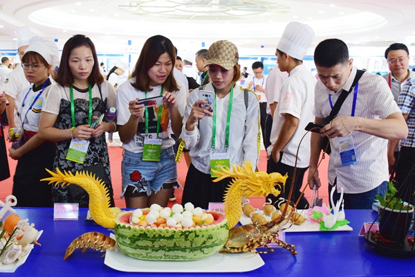 展览会上,我校烹饪与营养教育专业师生们展示的菜品紧扣海鲜主题,“龙腾湛江”、“银滩起舞”、“大鹏展翅”、“湛江生蚝荟萃”等一系列独具匠心的佳肴色香味俱全,受到观众“点赞”。“龙腾湛江”形似一条船,寓意着湛江丰富优质的海产品走向全国乃至全世界,“银滩起舞”描述了章鱼在沙滩起舞,寓意湛江经济能渔拓海洋,大振雄风。