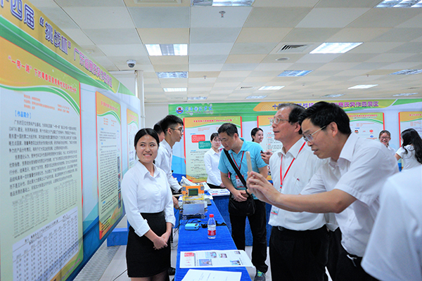 在第十四届“挑战杯”广东省赛获奖作品展区,罗海鸥与吴清基认真参观获奖作品,高度赞扬了《基于红外热成像技术构建电饭煲三维温度场的关键技术研究》项目具有较高技术和实用价值,同时也肯定了《精准扶贫背景下粤西农村电商扶贫现状的调查研究——以雷州市企水镇塘头村帮扶点为例》项目,认为它既具有奉献社会的爱心,又具有实际可操作性。
