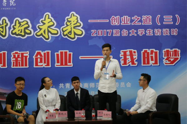 访谈和互动问答环节上,邓圣怀、王柏瀚、陈晓文、郑勇这四位创新创业达人上台与观众进行互动访谈。其中,来自台湾师范大学邓圣怀热情地向大家推荐了台湾美食——卤肉饭,他谦逊而幽默的谈吐瞬间拉近了湛台大学生之间的距离,现场气氛十分活跃。与此同时,四位嘉宾分别用小故事、亲身经历等方式生动地讲述了他们的创业经历,为现场观众支招答疑。