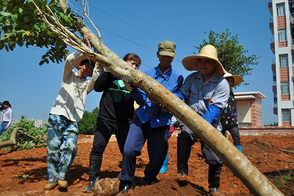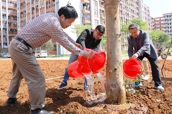 “大学要有大楼、大树、大师、大爱。”罗海鸥强调,十年树木,百年树人。重视植树造林是岭师的优良传统,打造“绿树成荫、香飘四季、花不间断、文化品位、师范特色”的理想家园,给广大师生提供优美舒适的学习、工作和生活环境,是我校校园建设的目标。湛江天气炎热、雨水多、台风多。因此,今年除了种植火焰树、桂花树等外,还着重种植了一批既抗台风又遮荫挡雨的榕树。希望若干年后,新区也像老区一样,遍地都是参天大树。