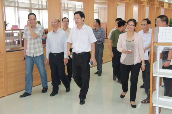 罗书记一行首先来到图书馆二楼大厅,就文化墙建设现场办公;接着,来到九楼特藏阅览室,指导刚建成的粤台教师教育资料中心的后续工作。罗书记认为,这是图书馆的一个特色区域,是图书馆服务学科建设的大亮点,也是我校与台湾高校交流合作的见证,希望继续加强特色馆藏建设,提供更多有特色的学科专业服务。在《续修四库全书》专柜前,罗书记取出一本,翻开阅读,询问该书的利用情况。罗书记还察看了发呆区、研修室、洗手间等情况,对洗手间设施提出更人性化的要求;建议在图书馆开设一个书店和咖啡厅,以更好地满足师生的需求。