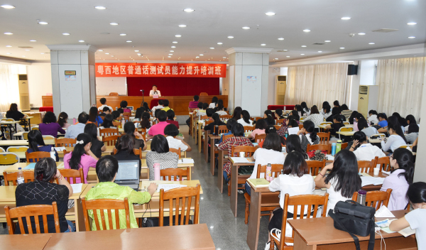 岭师新闻中心讯:“在北疆,那里的课堂跟五十年代扫盲班似的,有的老师是驻队干部教学生普通话,把‘西红柿’读成‘西轰市’。” 10月16日,教育部语用司姚喜双司长莅临我校,亲自为粤西地区普通话测试员能力提升培训班的全体学员上了生动的一课,强调语言文字工作的普及和规范关键要符合国家发展需求,要符合人民需求。