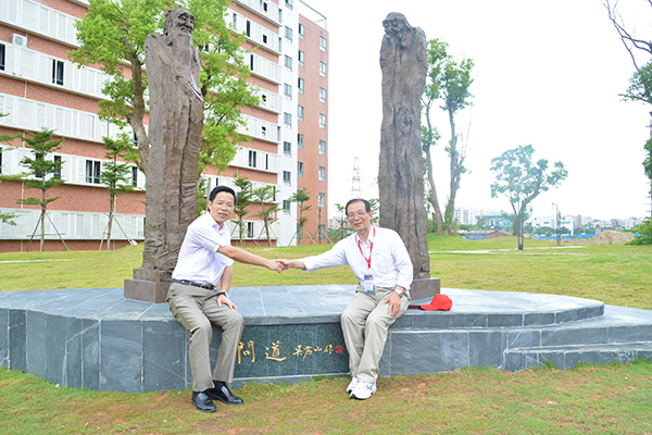 每到一个景点,罗海鸥详细地向来宾分享着学校在打造景观时的构思和内涵意蕴,他旁征博引、侃侃而谈,将“明德新民、止于至善”的大学精神如何贯穿在校园景观建设中娓娓道来。在慎思园,罗海鸥与校长教授们围坐一起,谈教育、谈人生、谈使命;在《问道》雕塑下,罗海鸥紧紧地握着吴清基的双手诚恳地说:“我们要向吴总校长问道建设高水平师范大学的办法”。此情此景,陈益兴感概地道,只有真正的教育专家,才会说到自己的教育理念时两眼发光。
