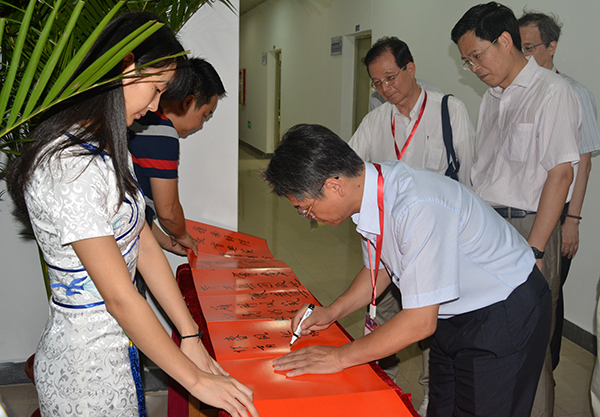 岭南新闻中心讯: 7月6日上午,台湾教育大学系统的总校长、台湾师范教育学会理事长吴清基,高雄师范大学校长吴连赏,台湾教育大学系统执行长丁一顾,屏东大学学术副校长林勤丰,金门大学学术副校长陈奇中、主计主任洪天然,明道大学陈益兴和我校客座教授冯观富等一行在学校党委书记罗海鸥的导引下参观校园,来宾们纷纷为我校文化校园建设点赞题词。