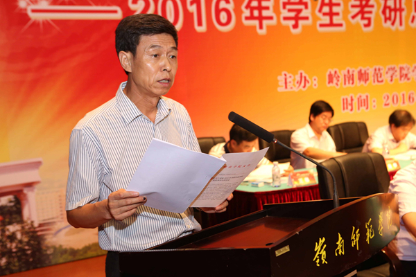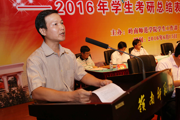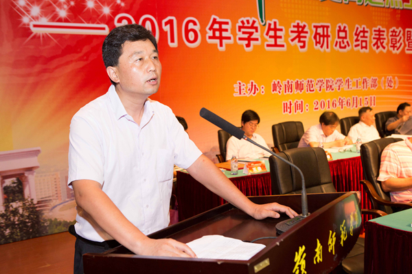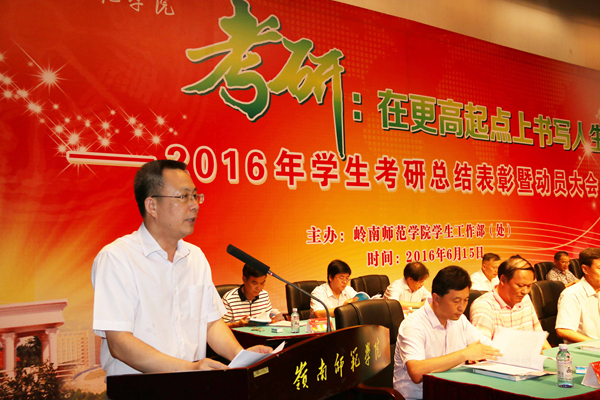 “岭师学子有一种自强不息、奋发向上、不甘人后的志气与精神,我为此感到骄傲。”在听取考研工作和考研经历经验分享的发言后,罗海鸥向考研成功的毕业生们表示祝贺,对我校考研工作取得的好成绩及考研学子的优异表现表示赞赏。他认为从这些优秀的学子身上,感受到的精神的力量、坚持的力量和激励的力量正在不断地提升和拓展:从以专业笔试第一考取武大哲学学院、身为贫困生却捐赠自己的部分国家奖学金来资助贫困学生的吴江玲同学身上,感受到了一种“生活不止眼前的苛且,还有诗和远方”的精神;从托福等考试了六次、坚持一首曲子练上一千四百多遍的罗鸣同学身上,感受到了一种“太阳之歌”在心底反复高唱的坚持;从在追梦的旅途中且行且唱、不忘初心、实现华丽转身的莫碧霞同学身上,感受到了一种“你若不努力,怎么知道自己有多优秀”的激励。罗海鸥指出,学生处、教务处等职能部门和二级学院以及广大教师重视考研、抓好考研,为考研学子们所做的辛勤努力和无私奉献,体现了一种责任和使命,一种良好教风、学风和校风,一种“学生考研我支持,考研成功我骄傲”的师德师风,让人感受到了岭南师范学院远大的前程和美好的未来。他用“我们的未来在远方”勉励广大岭师学子们志存高远、学业有成、报国荣校。