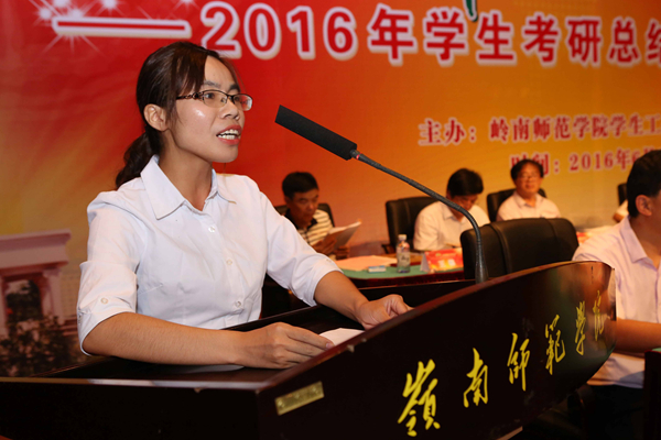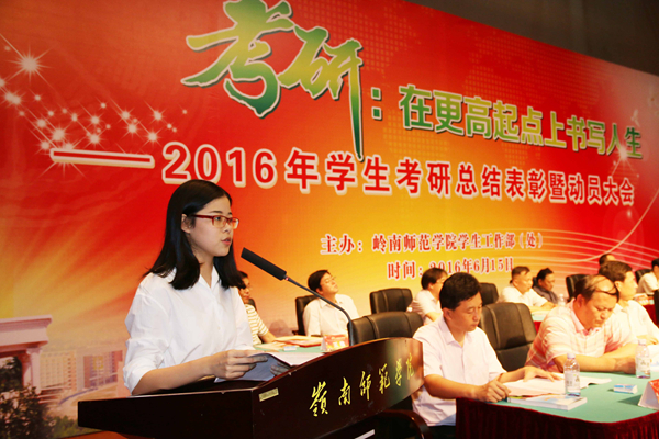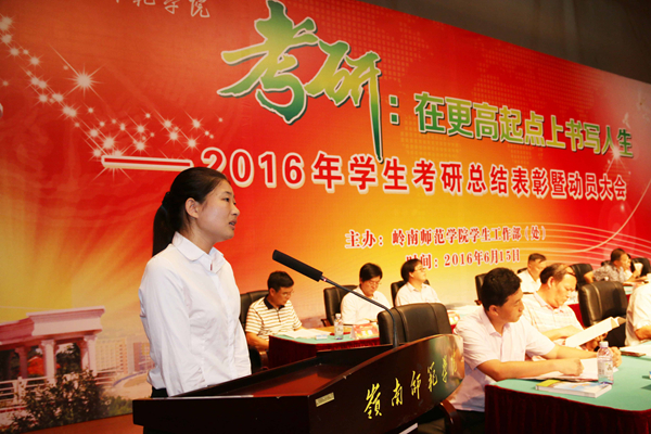 表彰会上,学校党委罗海鸥书记、彭权群副书记和邵乐喜副校长分别为4个2016年考研工作先进学院、4个2016年学生考研优秀动员奖和1个考研工作进步学院、13个2016年考研优秀学生代表等颁发了荣誉证书和奖牌,对获奖的学院和学生进行表彰和勉励。学生处李粤处长对2016年学生考研工作进行了总结,化学化工学院王胜院长、物理学院李忠院长、法政学院刘鑫淼博士、人文学院吴江玲同学、商学院莫碧霞同学、音乐学院罗鸣同学依次上台分享了自己在考研工作、指导学生以及考研等方面的经验和体会。据悉,2016年我校考研工作成绩突出,亮点纷呈:考研增长率高达33.4%,是全国研究生招生增长率(4.4%)的7.5倍;学生党员考取136人,占考取人数的31.6%,比应届毕业生党员比例(11.4%)高出20.2%。