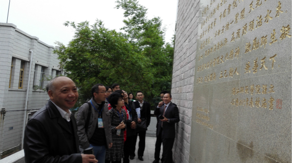 会议间隙,与会学者在蒋述卓的带领下,慕名参观了我校颇具特色的人文景观。大家先问道古榕广场,然后来到陶壁“问渠”参观,之后乘车沿燕岭大道一路进发,经博学园、过春晖园、师道园,再到树人广场,每到一处景点,大家都忍不住伫足观赏,拍照留念。