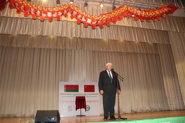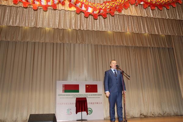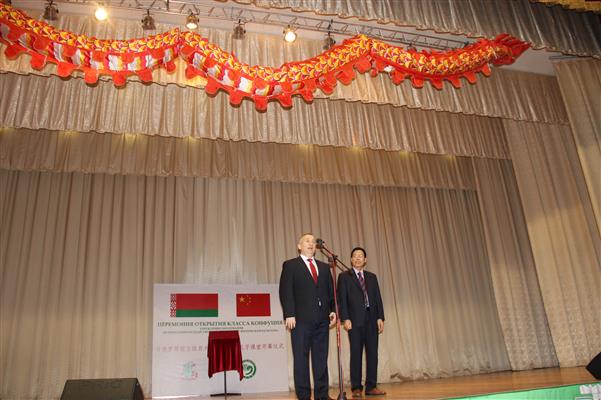 在仪式上,托吉克热烈祝贺孔子课堂的成立,特别强调孔子课堂是中白教育文化联系的桥梁纽带,希望双方以此为机遇,更好发展中白在体育文化方面的合作;沙莫克即希望合作双方借此平台,更好地发展体育项目和技术合作,推进双方体育人才培养;拉科夫在讲话中称不少白俄罗斯青少年都是通过孔子课堂(学院)的学习进而了解中国文化,这对发展两国友好关系意义重大;王大军代表我国驻白俄大使馆祝贺孔子课堂揭牌运行,这是在继吉林大学、大连理工大学、东南大学分别与白俄工业技术大学、白俄国立大学、明斯克国立语言大学共同开设孔子学院后在白俄第一所独立的孔子课堂。王大军说孔子学院(课堂)是连接世界人民文明的纽带,是传播中华文化和心灵沟通的桥梁。武术是中国文化的瑰宝,包含着中国体育博大精深的精神,白俄国立体育大学的孔子课堂以武术和中华养生及中文人才的培养为特色,将赋予孔子课堂新的内容和吸引力,孔子属于中国,也属于世界;孔子课堂中方负责人我校的宋鹏博士宣读了中国孔子学院(国家汉办)总干事许琳女士发来的贺信