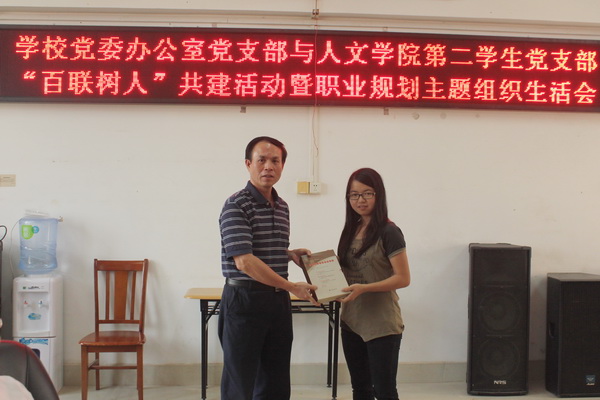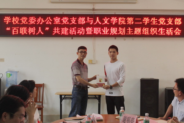 共建见面活动上,首先介绍了共建师生支部的党员情况以及“百联树人”支部共建的工作设想,党委办党支部与人文学院第二学生党支部共同签订了支部共建协议书。明确了在共建活动中开展组织建设互促、师生党员互动、党建载体互用、业务工作互助、科学发展共赢的共建活动,不断提高双方党组织的创造力、凝聚力和战斗力,特别地对支部共建的新内容——“百联树人”计划提出了实施方案。为实施“百联树人”计划中的“共读一本好书”项目,活动设置了赠书荐书的环节。梁英首先向学生支部党员代表赠送了凝聚我校文化育人成果的“文化育人”工作研究丛书,并对共建的学生党支部提出了多出文化成果、形成文化品牌的殷切希望。接着黄达海、赵海波等教工党员也分别向学生党员推荐和赠送了《平凡的世界》、《苦难辉煌》、《做最好的自己》等书,谈了推荐意见并寄予美好祝愿,师生交流了读书心得。