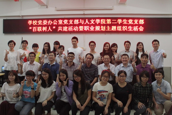 10月16日下午,学校党委办公室党支部与人文学院第二学生党支部联合在人文学院会议室举行“百联树人”共建见面活动暨职业规划主题组织生活会。学校党委梁英书记以支部党员的身份出席活动,寄语让“百联树人”计划更好促进学生成长成才。党委办公室主任、机关党委书记黄达海,人文学院党委柯春明书记、刘惠卿院长、钟明杰副书记以及共建的师生支部成员共30余人参加本次活动。会议由学校党委办公室副主任、支部书记赵海波主持。