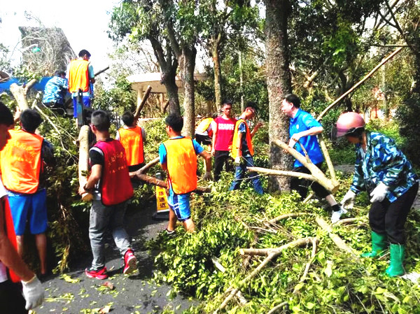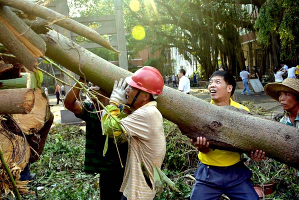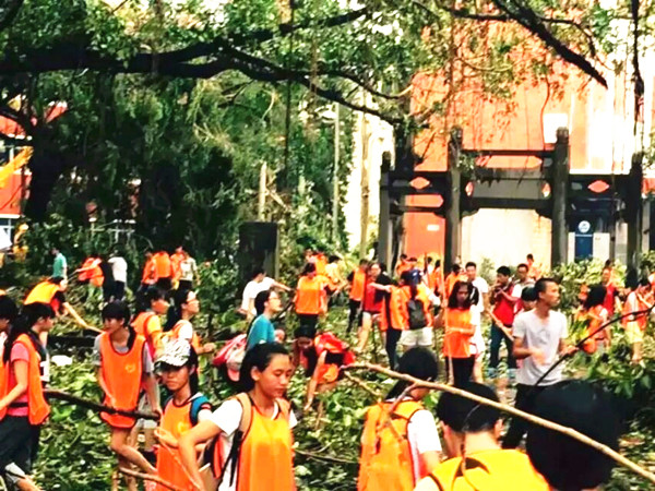 校团委卢福老师说,从5号开始,校团委立即组织志愿者参与灾后校园清理工作,但由于当天风雨仍在持续,便取消计划,出乎意料的是,仍然有部分志愿者冒雨前来清理校园,打扫卫生。从5日至7日,志愿者工作每天上下午分两批进行,每一批具体划为成砍刀组、装车组和搬运组,目前已有近2000多名志愿者参与其中,8日开学后,清理工作便由学院具体安排志愿者进行参与。卢福提到,“志愿者们非常用心,好几个同学的手都磨破了,他们仍继续过来砍树,让人很感动。”
