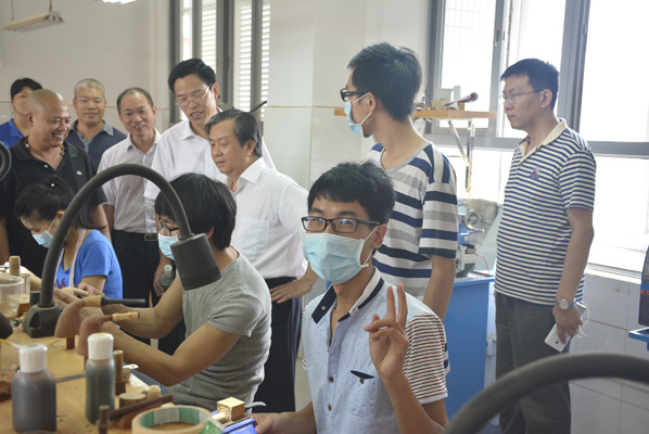 在罗海鸥校长的陪同下,何东平总编一行在书院广场、大型陶壁《问渠》、博学园、百年师范纪念广场、师道园、立德园和树人广场等景点驻足停留。罗校长如数家珍,向客人介绍了每一个景点的建设理念、文化内涵和教育意蕴,并带领大家来到了教四七楼,参观了由烟斗工艺大师陈灿聪校友主持的“岭南手作”工作室。
