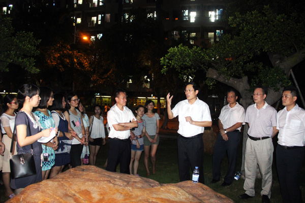 一众师生难离难舍,罗海鸥一行移步立德园,与人文学院、教科院的毕业生们驻足长谈,上了临别前的最后一堂德育课。不仅解读了立德园的建园构想以及背后的深刻含义,道出大学灵魂——明德新民,止于至善,更希望同学们共同扎根于岭南师院,向世界各地展现岭师学子卓越多元的才能。彭权群结合自身留校任教的经历,历数学校从雷州师范专科学校、湛江师范学院到岭南师范学院各个阶段的发展变化,谈到近年来学校育人环境的不断优化,充满人文气息,给予学生创造良好的成长条件,希望同学们谨记在母校的嘱托,奋力书写价值人生。毕业生们紧紧围绕着罗海鸥,争相表达对母校的不舍之情,拿着自己喜爱的书本,希望在临别前夜得到罗海鸥的亲笔题字。借着灯光,罗海鸥耐心地在每一本书的扉页写下了温馨的祝福。教科院的一位毕业生现场即兴表演了一段新疆舞蹈,给这个温情的夜晚增添了些许轻松快乐。
