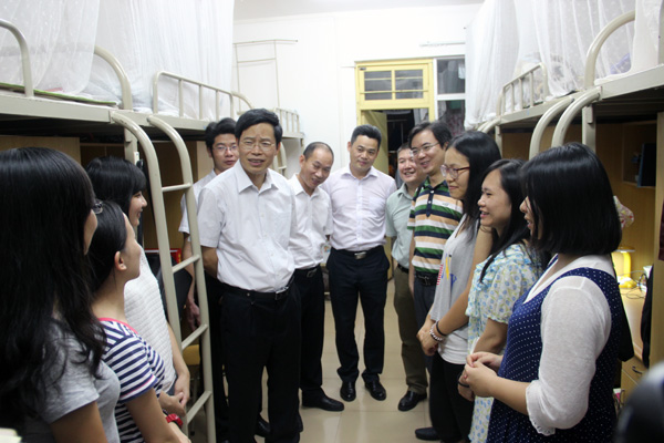 带着对岭师“儿女”们的不舍与牵挂,学校罗海鸥校长、彭权群副书记在校长办公室邓逢光主任、学生处李粤处长等人的陪同下走访毕业生宿舍,为离校在即的毕业生们送上母校深切的问候与美好的祝福。罗海鸥一行首先到尚雅二苑走访了化学院的毕业生宿舍,耐心询问了毕业生们就业的情况,勉励大家要发扬岭师精神,奋力拼搏,走好人生每一步。随后走进人文学院考研传奇宿舍,对其考研佳绩表示祝贺,并仔细询问毕业生近况,耐心倾听毕业生们在校四年的感受。罗海鸥还与大家分享岭师感动人心的故事,历数我校学生陈丽冰、王志平等优秀的人和事,以此共勉。如师亦如父,罗海鸥亲切地把毕业生们看作自己的儿女一般,临行细细叮咛。从宿舍出来,罗海鸥与坚守岗位的学生公寓工作人员亲切交谈并一一握手,对学生公寓工作人员的工作给予高度赞誉,“你们是学校最基层的员工,虽然拿着微薄的工资,但是学校必不可少的一部分,为学校的发展做出了必要的后勤保障,没有你们学校一天也办不下去。”罗海鸥还询问了工作人员的工作和待遇,表示学校会努力改善基层员工的福利待遇,增强其归属感。