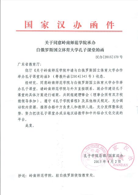 近日,我校收到国家汉办《关于同意岭南师范学院承办白俄罗斯国立体育大学孔子课堂的函》汉办【2015】179号,批准我校与白俄罗斯国立体育大学合作举办有武术和中国传统体育康复保健特色的独立的孔子课堂。