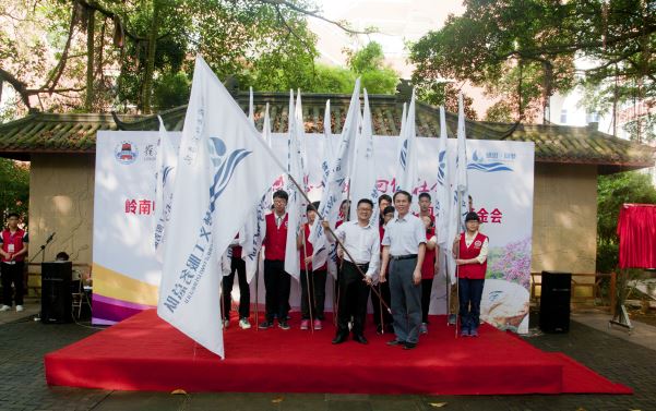 接着,大会进行了揭牌和授旗仪式。伴着慷慨激昂的音乐声,所有与会领导和嘉宾一起为义工服务站和基金会揭牌。在紧接着的授旗仪式中,梁英书记亲自为校级义工服务总队和分队一一授旗。15面队旗在总队长和分队长手中挥舞飘扬,预示着“感恩·圆梦”义工服务队这一新的队伍将从此在燕岭的沃土上扎根成长。全体参会的学生代表在总队队长梁煜鹏老师的带领下庄重宣誓:永怀感恩之心,回馈社会之行!上千名同学洪亮坚定的宣誓声在百年榕树间久久回荡。