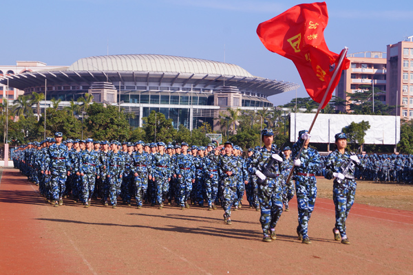 上午9点30分,阅兵暨总结表彰大会在庄严的迎校旗仪式中拉开帷幕。随后,在中国人民解放军91487部队何志高处长的陪同下,学校党委梁英书记检阅了军训团,并亲切问候各方阵的同学们“同学们好!”、“同学们辛苦了!”。同学以坚定洪亮的“首长好“、“为人民服务!”回答。随后,在雄壮的《中国人民解放军军歌》伴奏中,分列式正式开始,各个方阵迈着整齐的步伐依次经过主席台,向教官、老师们展示军训的成果,赢得了主席台上阵阵掌声。