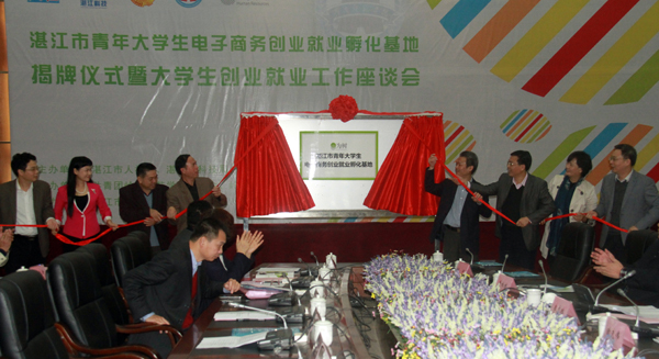 为贯彻市委、市政府关于加强大学生创业就业工作的部署和要求,帮助青年大学生成功创业就业,进一步推动湛江经济社会发展,1月6日,湛江市青年大学生电子商务创业孵化基地揭牌仪式暨大学生创业就业工作座谈会在我校国际会议厅举行。湛江市政协副主席、科技局长欧先伟,我校党委书记梁英、副书记刘海涛、彭权群,市人社局局长李更盛,市妇联主席陈翔等领导,市工商局、经信局、财政局、教育局、地税局等职能部门及赤坎区领导和有关各大银行、驻湛高校、企业家代表等近两百人出席了活动,会议由团市委书记李志鹏主持。