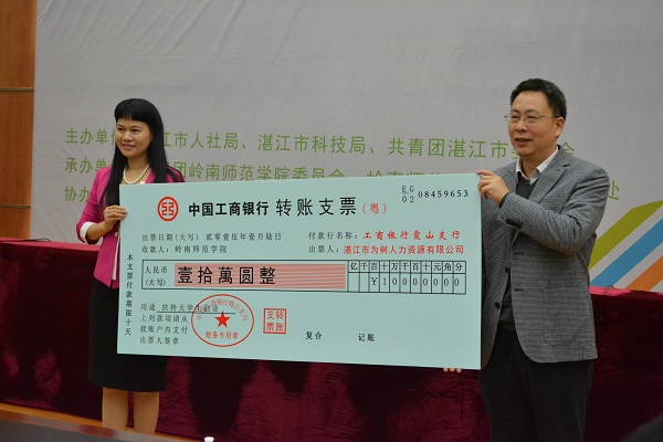 随后,市政协副主席欧先伟,我校党委书记梁英,副书记刘海涛、彭权群,市人社局局长李更盛,市妇联主席陈翔等领导嘉宾共同为湛江市青年学生电子商务创业就业孵化基地揭牌。湛江市为树人力资源有限公司董事长赵莉瑜为孵化基地捐赠十万元的扶持基金,总经理蒋文天做了孵化基地简介和服务大学生创业就业工作展望。