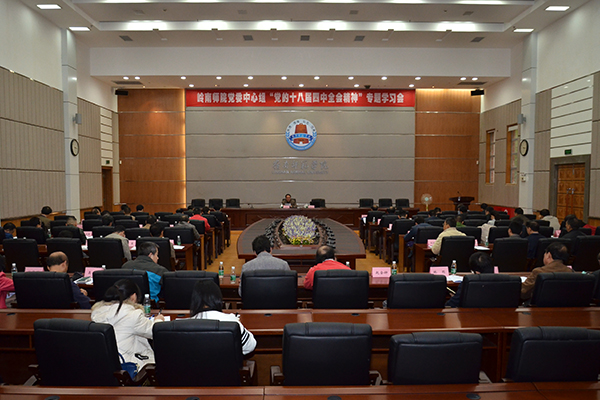 新闻中心讯:12月4日下午,我校党委中心组在国际会议厅举行集中学习会,深入学习贯彻党的十八届四中全会精神及中共中央办公厅印发的《关于坚持和完善普通高等学校党委领导下的校长负责制的实施意见》文件精神。省委教育工委巡查组组长省教育厅胡振敏副巡视员、巡视组成员赵文嘉出席了学习会,我校全体校领导,学校党委中心组成员、党委委员、各单位主要负责人参加了学习会。学习会由学校党委梁英书记主持。
