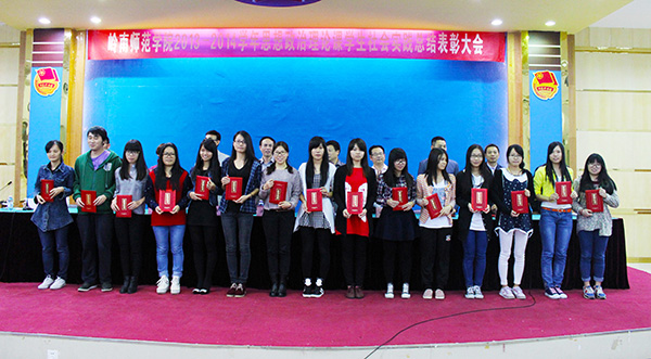 岭师新闻中心讯:11月13日晚,思政部在弘雷楼311室举行2013—2014年思想政治理论课学生社会实践总结表彰大会,对过去一学年学生社会实践的优秀成果进行表彰。学校党委梁英书记、黄钢副院长、党办黄达海主任、宣传部谢应明部长、人事处张飞燕处长、学生处李粤处长、团委郭和才书记、思政部何增光主任、教务处周立群副处长等出席本次大会,各二级学院党委副书记、思政部全体教师及学生代表参加了大会。会议由思政部洪小瑛副主任主持。