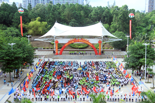 激情深入实践,勇于追梦不止步;青春奉献基层,增长才干竭全力。7月5日上午,我校与市科协精心筹备“美丽青春献基层•厚德笃行惠社会”2014年大学生暑期 “三下乡”社会实践活动暨“科普下乡惠农惠民”行动出征仪式在雷阳广场举行。学校党委梁英书记、彭权群副书记,团省委学校部武一婷部长,湛江市科协肖斌主席,团市委郑克芬副书记,市教育局党组成员任心田副调研员、团赤坎区委吴启智书记、麻章区教育局梁学龙副局长等领导以及我校大学生社会实践领导小组全体成员、近8000人组成的201支实践队伍参加了此次出征仪式。出征仪式由校团委郭和才书记主持。