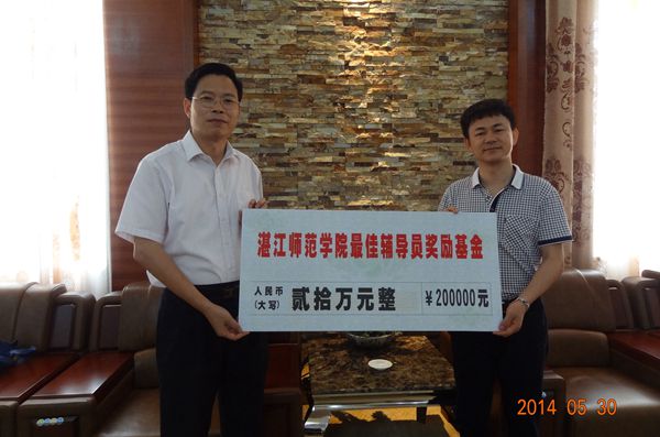 报告会由外国语学院曹志希院长主持。罗海鸥院长代表学校向黄刚校友颁发了“创业导师”证书,并赠送《问渠》陶壁缩微纪念品。黄刚校友为母校捐赠20万元人民币,设立“湛江师范学院最佳辅导员”奖励基金,罗海鸥院长愉快接受了捐资助教牌匾,这开辟了我校由校友捐赠奖教基金的先河。