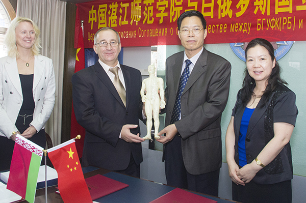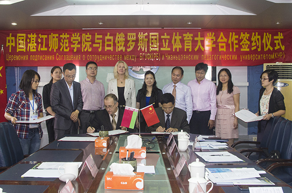 湛师新闻中心讯10月18号,白俄罗斯国立体育大学校长卡萨琴科教授,体操与舞蹈运动学院院长波洛杰维奇教授一行两人应邀来我校进行交流访问,罗海鸥校长在学校一号会议室举行欢迎交流会,商谈并签定双方合作交流协议。国际交流与合作处处长邓逢光、体科院院长章晓霜、人文院院长刘惠卿、体科院副院长温搏、国际交流与合作处副处长肖建春等参加了交流会。