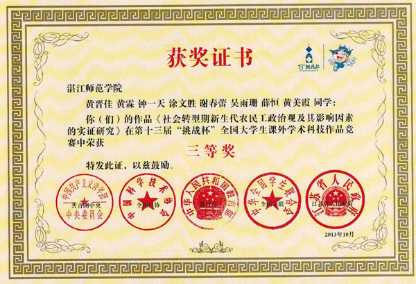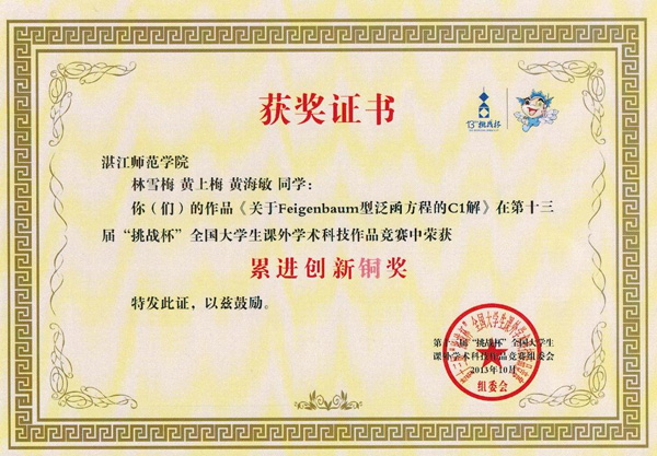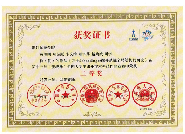 最终,在我校入围全国终审决赛的作品的两份作品,全部获奖。其中黄旭明、莫苡跃、车文海、郑宇莎、赵婉娥等同学申报的作品《关于Schrodinger微分系统全局结构的研究》(指导教师:李晓培)与来自北京大学、中国科技大学、南开大学等高校作品(数理类作品中,该作品作为唯一一份非“211”、“985”高校作品)同场竞技,荣获全国二等奖,这是我校该项赛事所获的最高奖项;黄晋佳、黄霖、钟一天、涂文胜、谢春蕾、吴雨珊、薛恒、黄美霞等同学申报的作品《社会转型期新生代农民工政治观及其影响因素的实证研究》(指导教师:郑剑虹、郭和才)荣获全国三等奖;另我校作品《关于Feigenbaum型泛函方程的c1解》获“累进创新铜奖”(指导教师:李晓培),我校首次获此殊荣(全国共103份),充分展示了我校学生较强的创新意识和创新能力。前来我校展位指导工作的各级领导和学习观摩团也充分肯定了我校参赛作品的质量和科技育人成效。