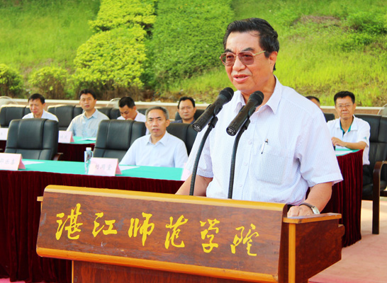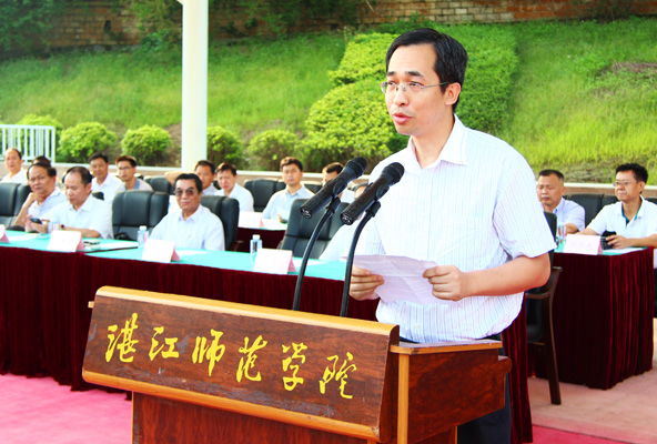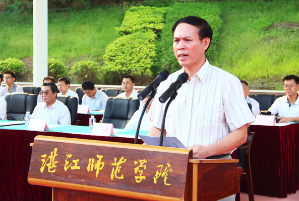 在学校党委刘海涛副书记的主持下,全体起立,奏唱国歌。嘹亮的歌声彰显着新生们的青春与激情。接着,校党委梁英书记发表题为《怀抱使命 实现梦想 以湛师为新起点》的致辞。梁英书记首先代表学校对2013级新生的到来表示热烈的欢迎。接着他从“文脉传承、昌明博大”、“兴学育才、匡时济世”、“综合性强、成绩斐然”这三个方面介绍湛师的办学历史、学府精神、师资力量、师生成就、学校荣誉等情况,增进新生们对学校的了解,增强荣誉感和自豪感。梁英书记希望同学们尽快完成角色的转变,更好适应大学生活,积极践行“崇德、博雅、弘志、信勇”校训,努力进取,做到“崇德厚道,锤炼品格”、“博学多识,文明雅致”、“恢宏大志,自强不息”、“忠诚信实,奋勇以求”,当好一名湛师学生,成长为一名高素质应用型人才。最后,梁书记列举了我校历届优秀毕业生的例子,勉励同学们不仅要“始终与民族、国家同呼吸、共命运”,而且 “把‘阳刚有为,实学报国’作为自己的价值追求,求学发展,追求卓越,敢为人先,立己树人,建树新风”,成为一名能够肩负时代使命品学兼优的“湛师人”。