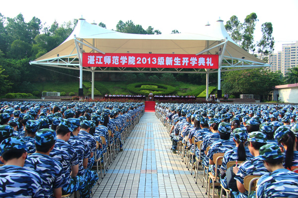 湛师新闻中心讯 百岁古榕喜迎新,少年新人欢聚首。9月9日上午,我校在雷阳广场举行2013级新生开学典礼。沐浴在和煦的晨光中,2013级新生身穿海蓝色军服,排着整齐的方队。校领导、相关职能部门主要负责人、各二级学院主要领导和相关老师出席了本次开学典礼,共同迎接“大学新鲜人”们的到来。