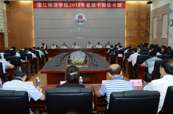 湛师新闻中心讯 8月30日下午至8月31日,我校2013年暑期干部读书班在国际会议厅举行。读书班主题为:全面贯彻落实党的十八大精神,推动开展党的群众路线教育实践活动,努力营造“转作风,办实事,抓落实,促发展”的良好氛围,以作风建设的新成效凝聚起建设特色鲜明的高水平师范院校的强大力量。本次读书班是在全国深入开展党的群众路线教育实践活动、全省着力扩大高校办学自主权、推进“四重建设”、建设现代大学制度的背景下召开,是我校教育实践活动集中学习的内容,通过学习贯彻上级会议精神、通报为师生办实事中期进展、分组讨论和汇报总结等内容形式开展学习。全体校领导和校内副处级以上干部(含相当),基础教育学院、附中党政正职等170多人参加了读书班。