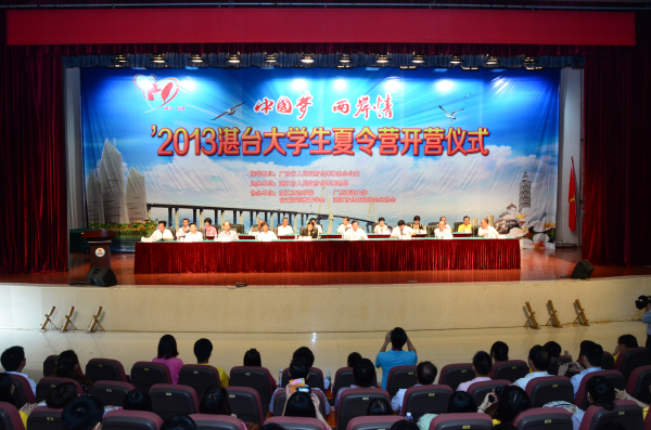 湛师新闻中心讯 7月1日上午,以“中国梦 两岸情”为主题的2013湛台大学生夏令营开营仪式在我校音乐厅隆重举行。台湾代表团总领队、台湾师范教育学会理事长、台湾教育大学系统总校长吴清基,台湾代表团副总领队、台中教育大学校长杨思伟,台湾代表团总顾问冯观富教授,台湾陶壁艺术家朱邦雄,广东省台湾事务办公室副巡视员林华轩,湛江市委常委、宣传部部长卢瑜,湛江师范学院罗海鸥院长、刘海涛副书记、李江凌副院长,以及广东省台办、湛江市相关部门负责人和来自台湾师范大学、成功大学、台北市立教育大学、台中教育大学、新竹教育大学、屏东教育大学、广东海洋大学和湛江师范学院的200名师生出席。开营仪式由湛江市委副秘书长刘耀千主持。