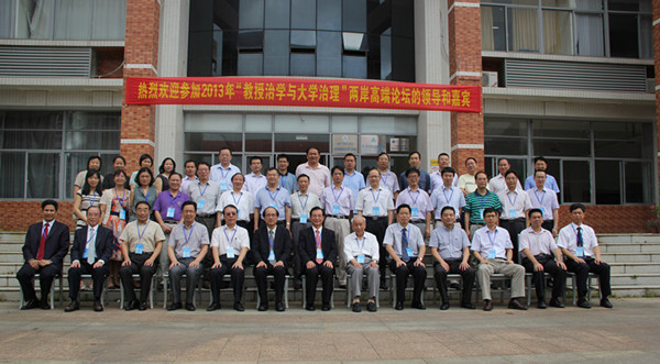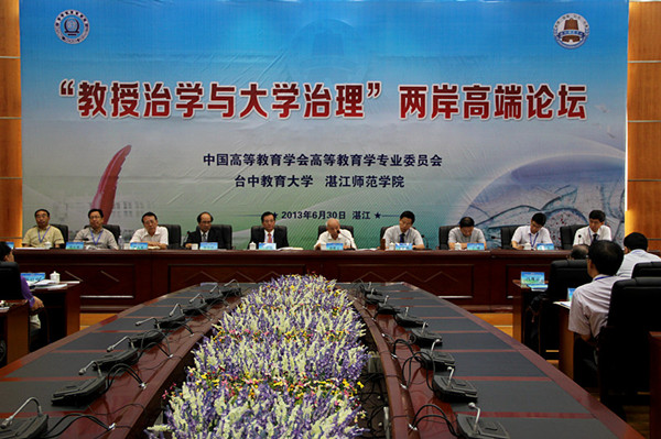 由中国高等教育学会高等教育学专业委员会、湛江师范学院和台中教育大学联合主办的“‘教授治学与大学治理’两岸高端论坛”于2013年6月30日在湛江师范学院国际会议厅隆重举行。与会的校外专家学者有:中国高等教育学会高等教育学专业委员会终身名誉理事长潘懋元先生,台湾师范教育学会理事长、台湾教育大学系统总校长(前台湾“教育部”行政负责人)吴清基教授,台中教育大学校长杨思伟教授,中国高等教育学会副会长、厦门大学副校长邬大光教授,中国教育学会副会长、华东师范大学教育高等研究院院长、终身教授丁钢,中国高教学会高等教育学专业委员会理事长、华中科技大学教育科学研究院院长张应强教授,广东省教育厅高教处处长郑文教授等来自海峡两岸高校的知名专家和领导。我校罗海鸥院长、刘海涛副书记、邵乐喜副院长等校领导,湛台交流合作联络人冯观富教授,教务处处长程可拉教授、科技处处长金义富教授、教育科学学院院长范兆雄院长、教育研究院副院长左兵副教授及教育学学科的部分骨干教师参加了本次会议。