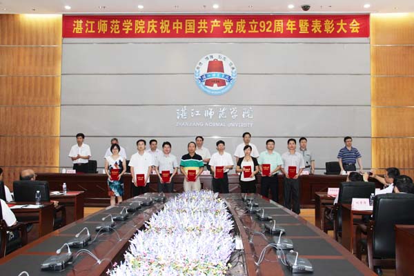 湛师新闻中心讯 6月28日上午,我校在国际会议厅举行庆祝中国共产党成立92年暨表彰大会。全体校领导,校党委委员、纪委委员,二级党委、党总支委员;党群部门负责人;受表彰的先进党组织负责人、优秀党务工作者、优秀党员代表出席大会。会议由学校党委黄刚副书记主持。