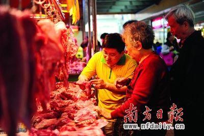 杨柏成热心向顾客介绍如何挑选瘦肉。