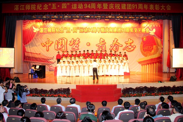 湛师新闻网5月6日讯 为纪念五四运动,传承五四精神,深入学习贯彻党的十八大精神和深化贯彻“中国梦”的重要内涵,4日晚,我校“中国梦·青春梦”纪念五四运动94周年暨庆祝建团91周年表彰大会在音乐厅隆重举行。