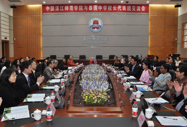 湛师新闻网3月17日讯 15日上午,泰国26所中学校长代表团来校访问,与我校签订合作协议。上午8时,我校在国际会议厅与来访的泰国26所中学校长代表团举行了交流会并分别与26所泰国中学签订合作协议。除来访的26所中学校长代表团37人之外,我校刘周堂副院长、国际交流与合作处邓逢光处长、人文学院谢应明书记、教科院范兆雄院长、外语院曹志希院长、晋学军副院长、冯彩莲副书记、国际交流与合作处郑志军副处长、肖建春副处长和相关工作人员,我校2012年曾经参加赴泰实习项目的部分同学,来自泰国中学在我校参加汉语学习和中国文化体验营的师生31人以及泰国SPN公司代表出席了此次交流会。邓逢光处长主持会议。