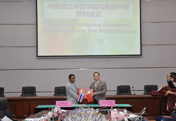 在共同观看了我校宣传推广片后,双方就进一步合作进行了商谈,并达成了合作意向。双方就“泰国中学作为湛师对外汉语等专业学生汉语教学实习和就业基地”、“湛师作为泰国中学对外汉语师资培训基地”、“湛师作为泰国中学生汉语学习、中国文化体验和学习深造基地”和“合作在泰国中学建立孔子课堂”等几方面开展达成一致。随后,双方举行了隆重的签约仪式。受校领导委托,邓逢光处长代表学校分别与泰国26所中学正式签署了合作协议。