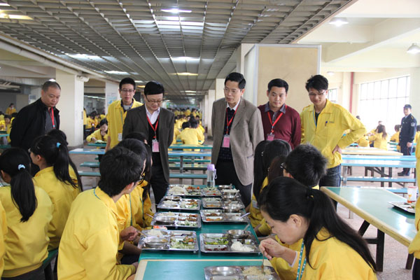从生产车间出来后,罗院长一行又参观了员工活动中心,走访了员工食堂,参加了寒假勤工俭学学生迎春座谈会并与学生代表共进午餐,和同学们进行亲切交谈,进一步了解同学们勤工俭学的情况。同学们纷纷表示,学校统一组织的勤工俭学活动,既让大家有保障地通过劳动积攒生活费,更让大家有机会近距离接触先进的生产管理经验和企业文化,厂方总经理朱承平博士也专门给我校学子作了职业生涯规划的专题讲座,是一次非常好的学习和锻炼机会,非常感谢学校。其中,也有同学反映个别车间有异味、有些车间安排的工作量不够、饭堂饭菜偏辣等问题,罗院长、李副院长一方面指示学生处值班干部与厂方加强沟通,尽量协调;另一方面,以他们青年时代艰苦的生活经历,教育同学们正确认识到工厂就是体验生活、磨炼意志、积累经验的,东聚公司已经为大家提供很好的工作环境,大家要学会珍惜机会,要服从大局安排,要善于运用我们的知识克服工作中遇到的一些困难,才能在岗位上取得更大的收获,更好地成长。